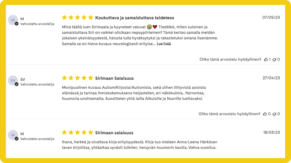 Kirjan tapahtumien edetessä Siri saa selityksen vierauden tunteilleen, kun hänellä todetaan autisminkirjon häiriö.